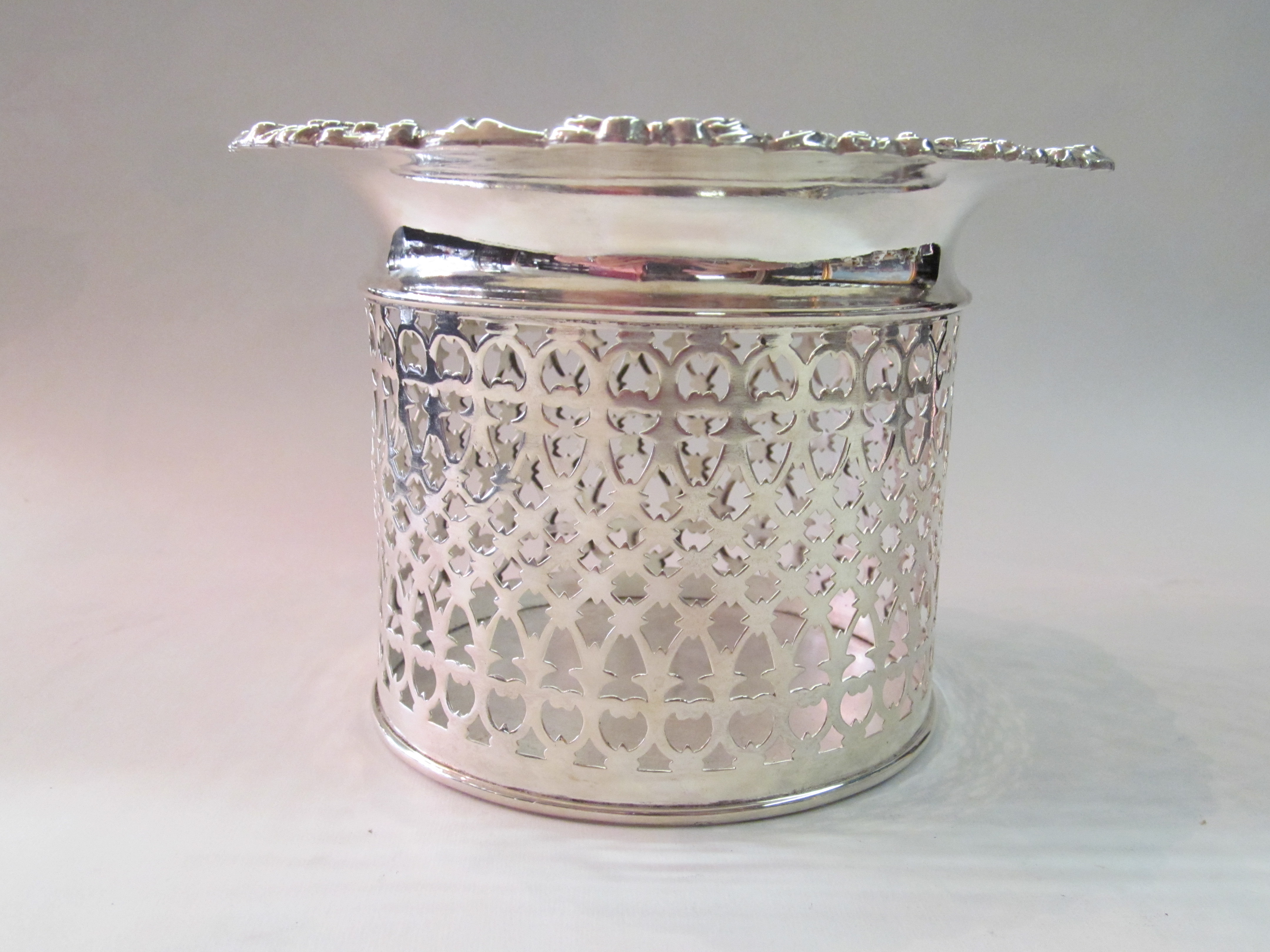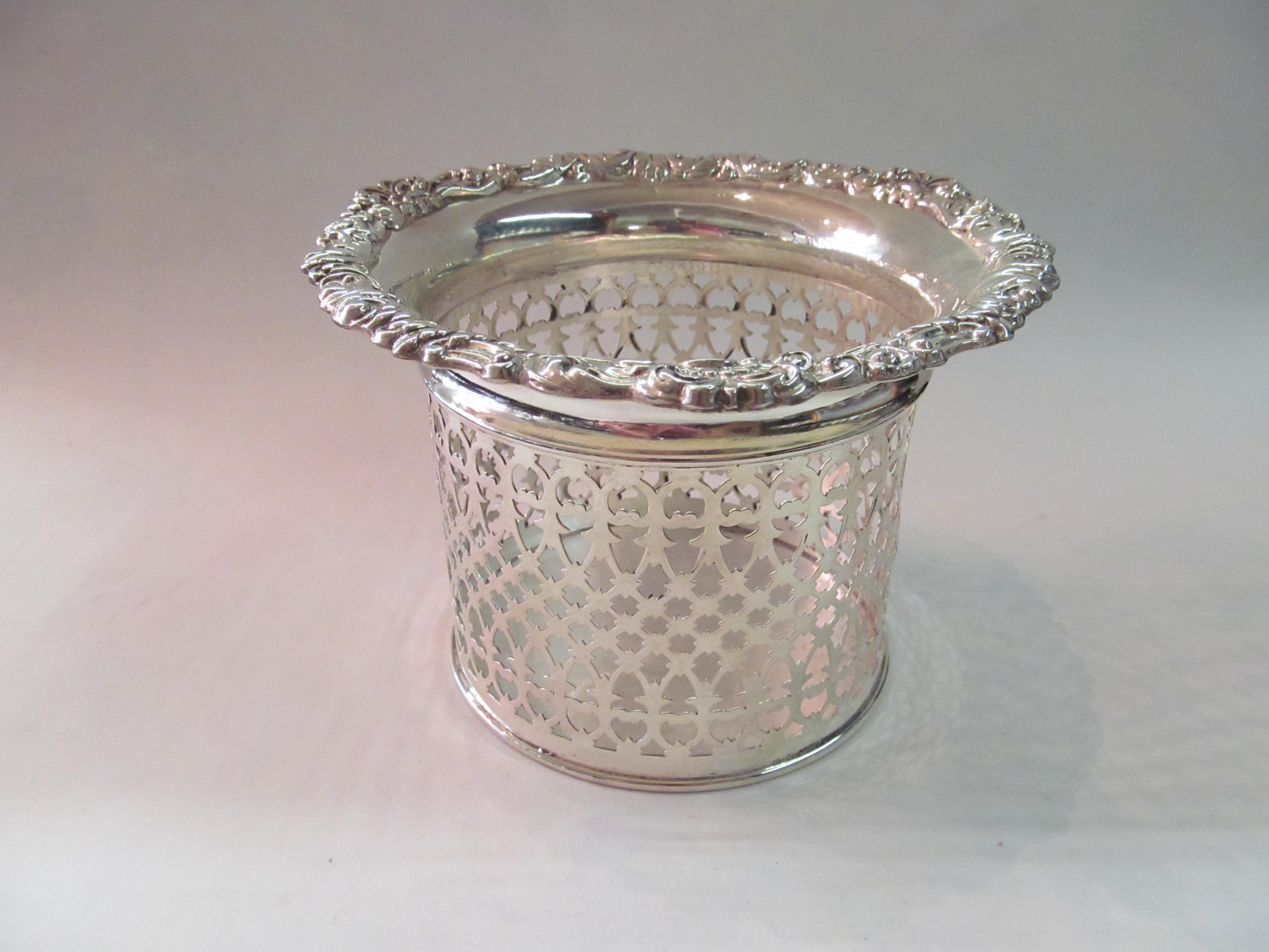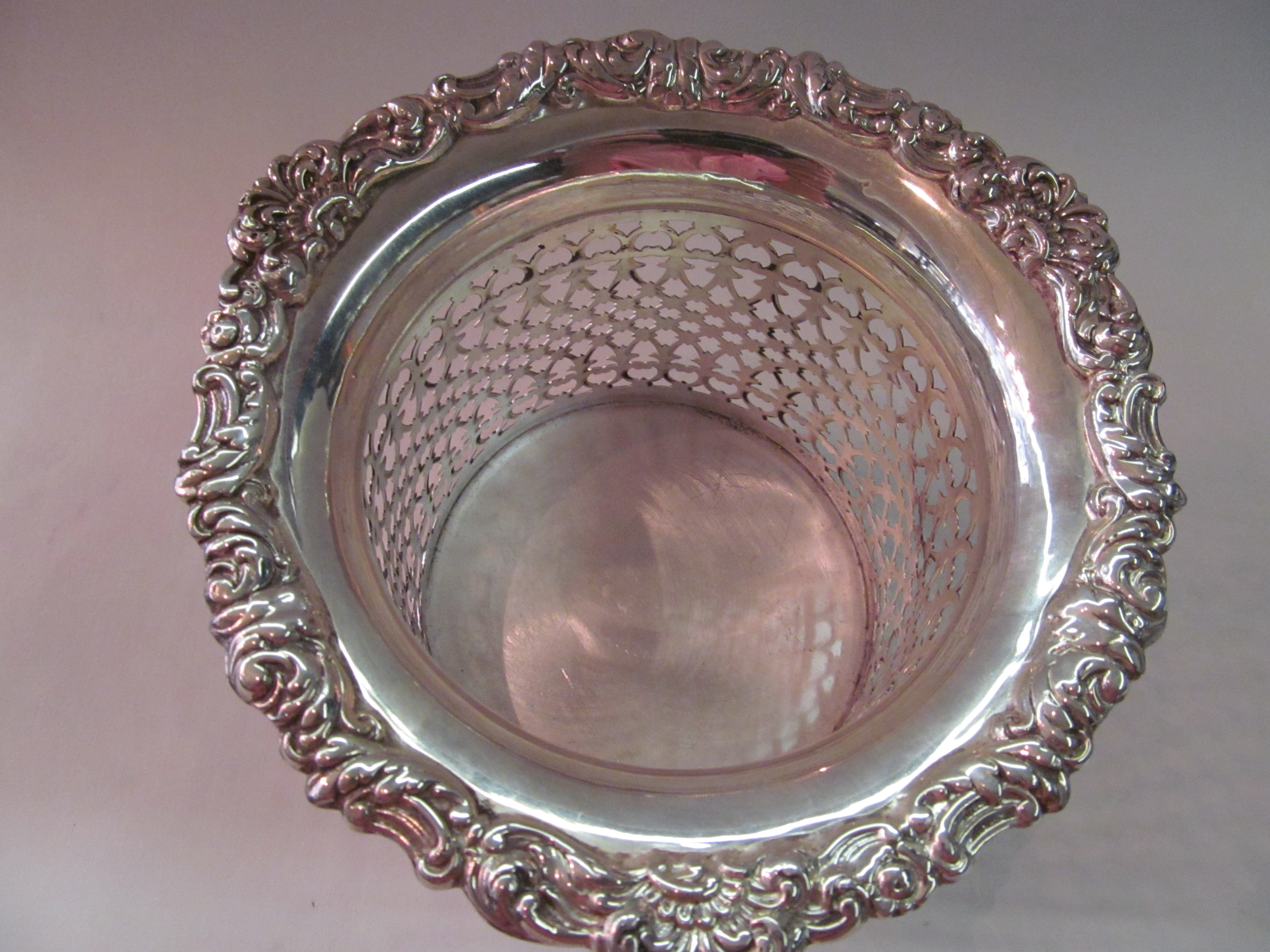 Finest Quality Antique English Silverplate Hand Pierced Body Rococo Border Large Magnum Coaster.