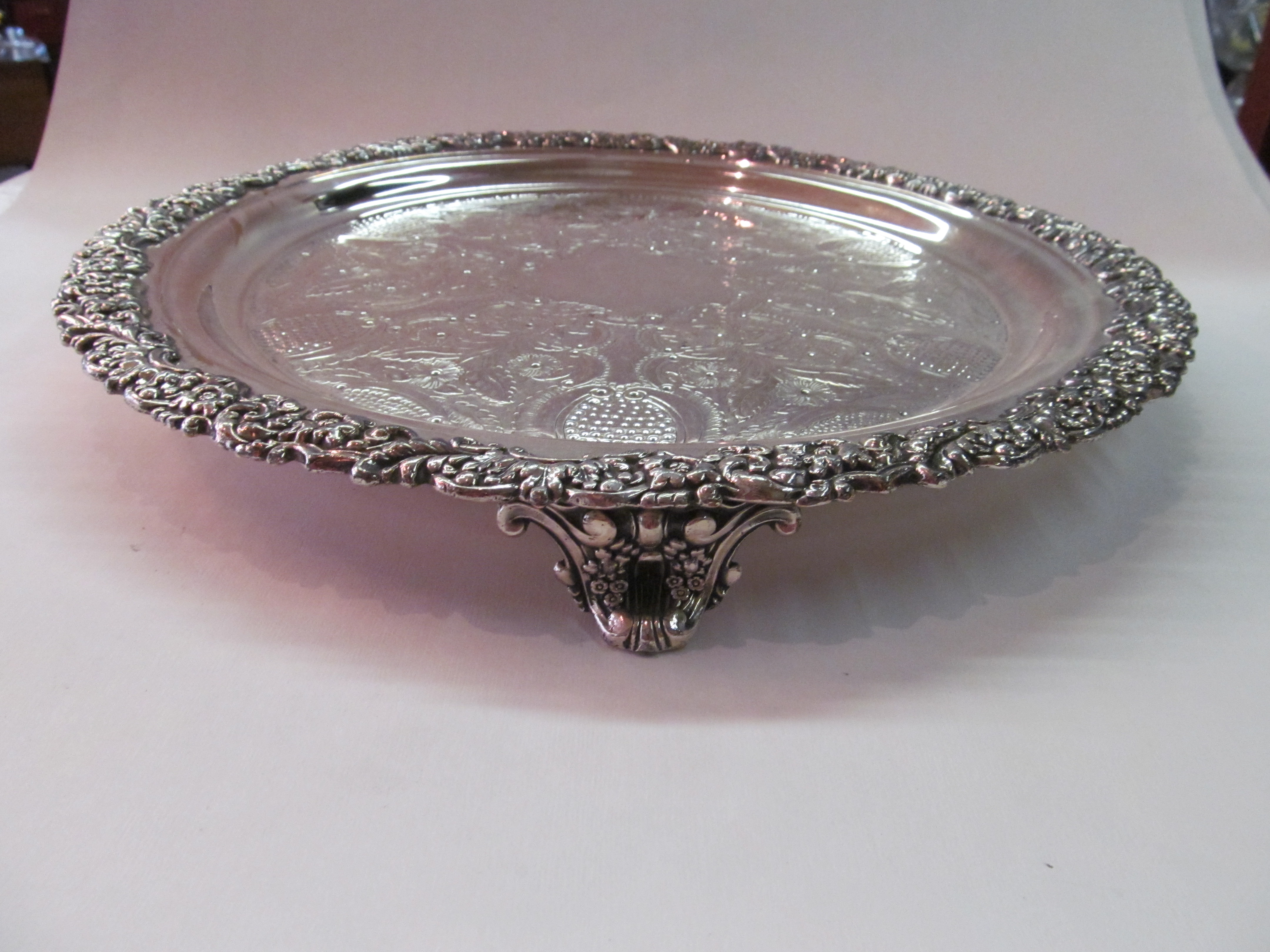 Superb Geo. III Old Sheffield Antique English Silverplate Hand Chased Large Rococo Border Footed Salver.
