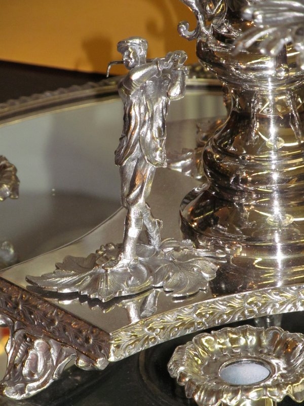This is a mid-century re-strike of an original Late Victorian British golfing centerpiece epergne. The original, Circa 1895