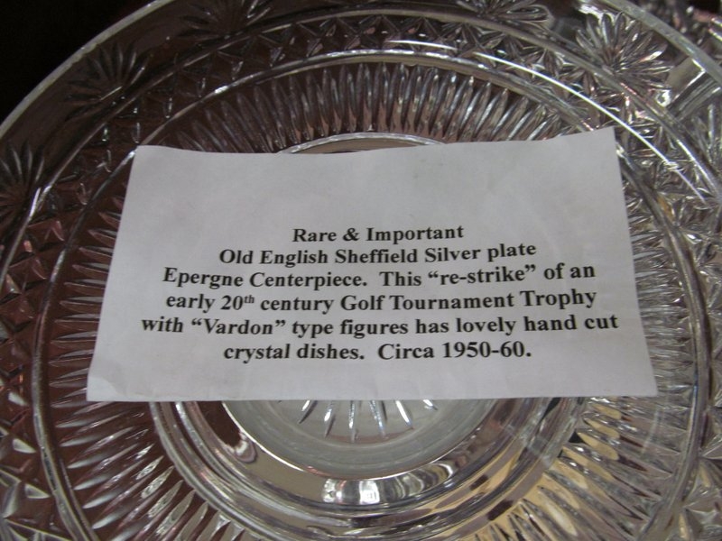Rare and Important Exceptional Quality Old English Sheffield Silverplate and hand cut crystal golf motif epergne centerpiece with convertible dishes and candle bobeches