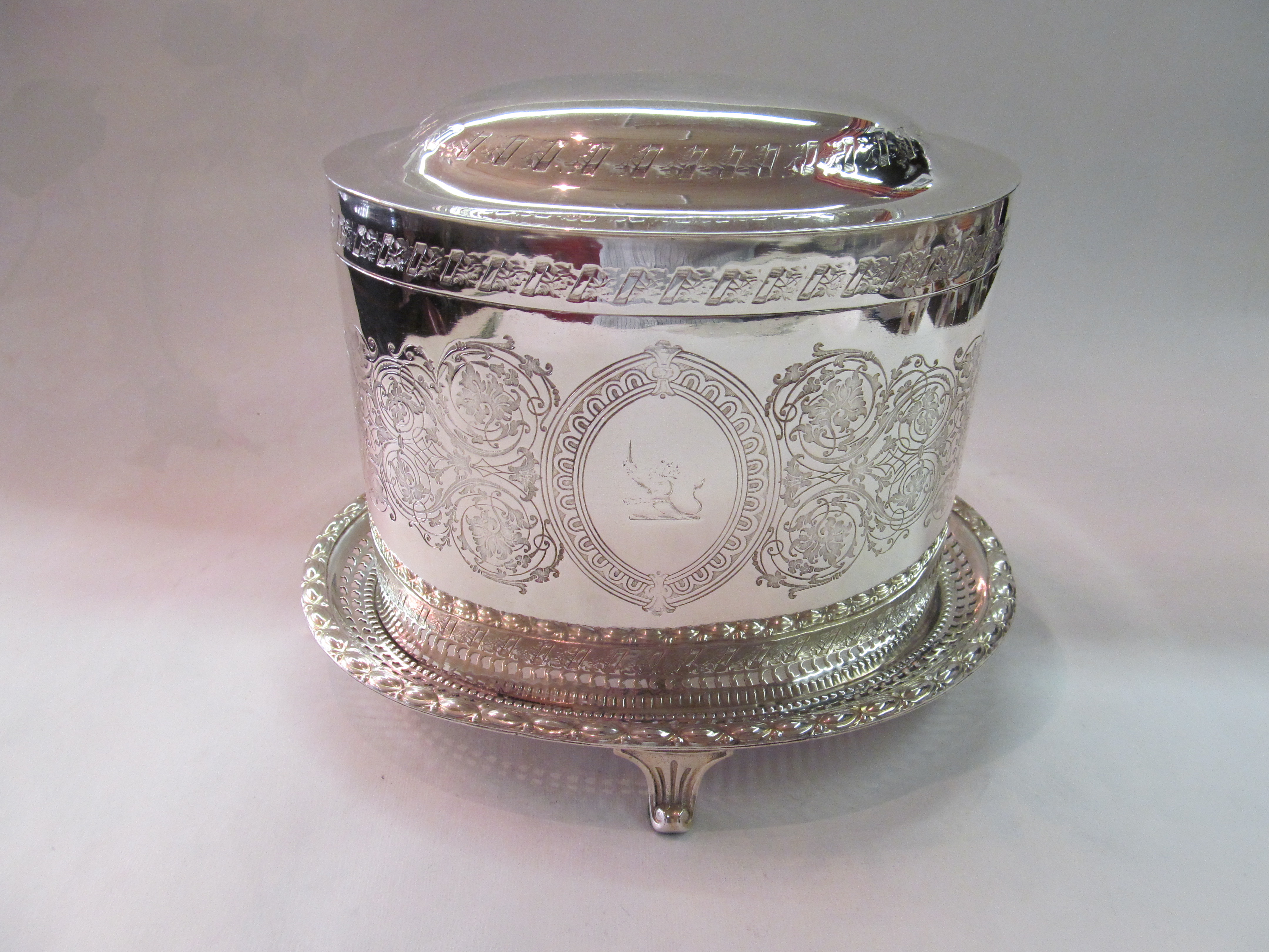 Fine Quality Antique English Silverplate Flat Chased Oval Biscuit Box. Circa 1868.
