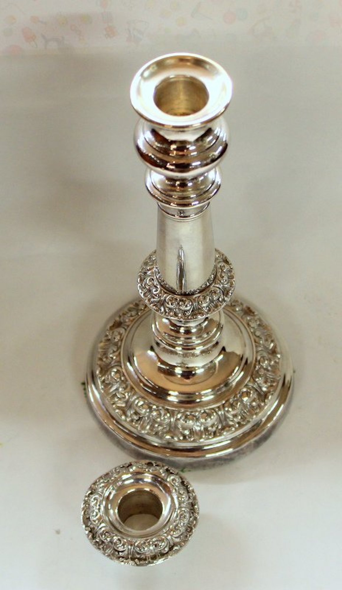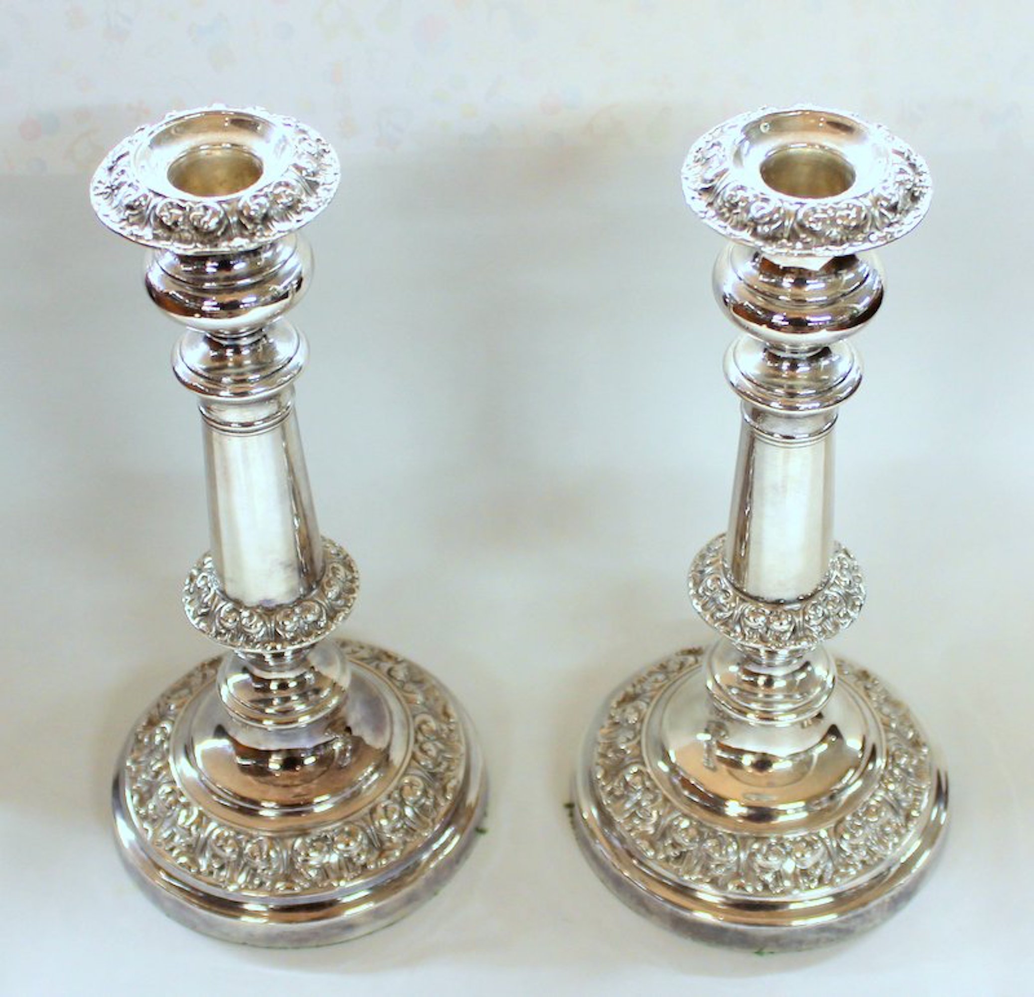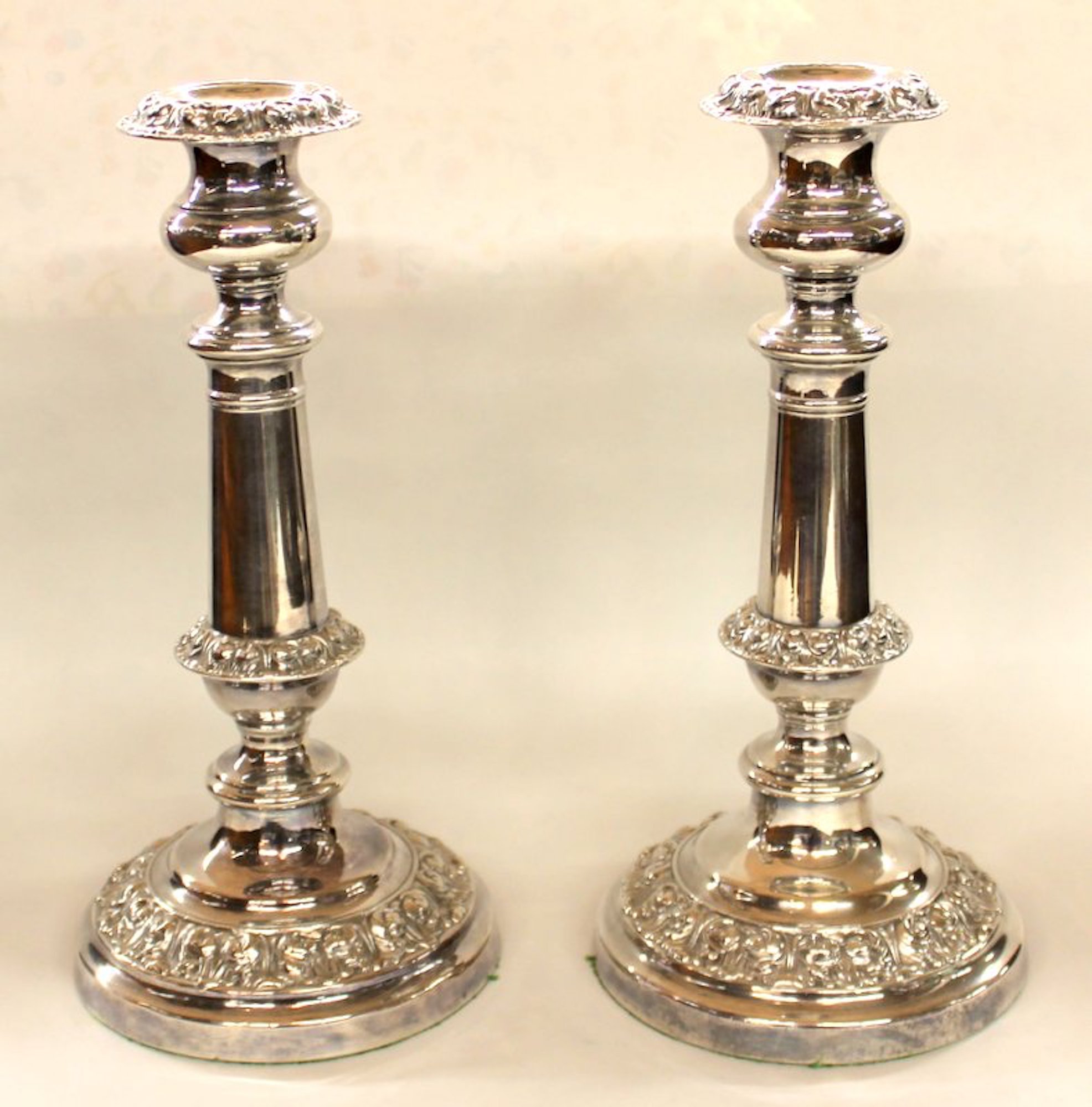 PAIR of Fabulous George IV Rococo Border Round Base Candlesticks