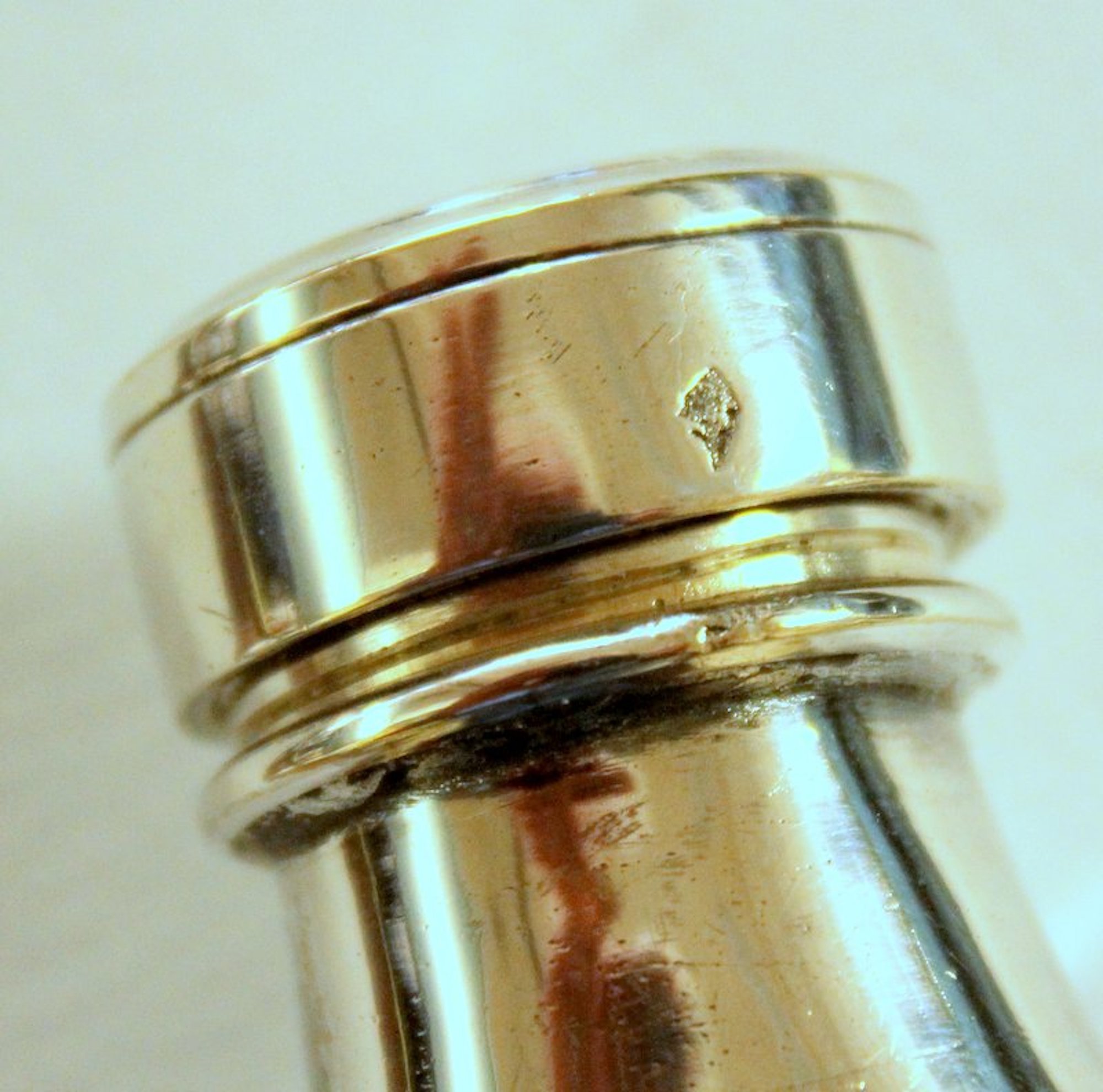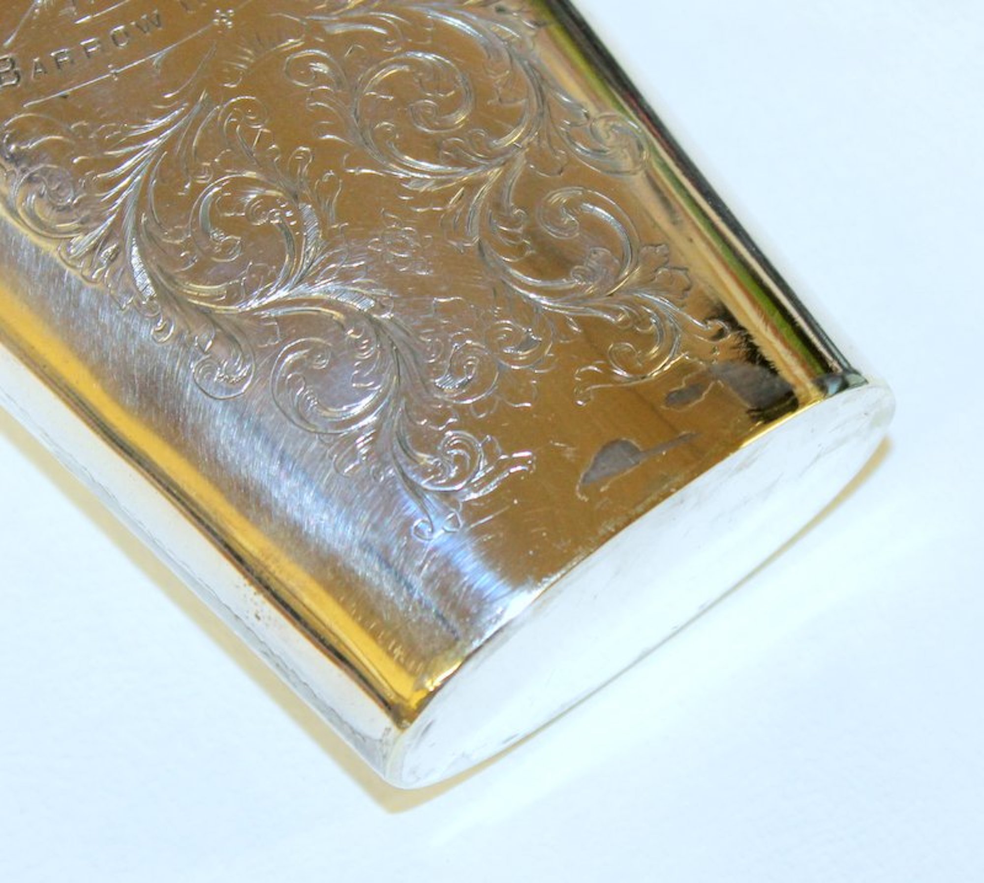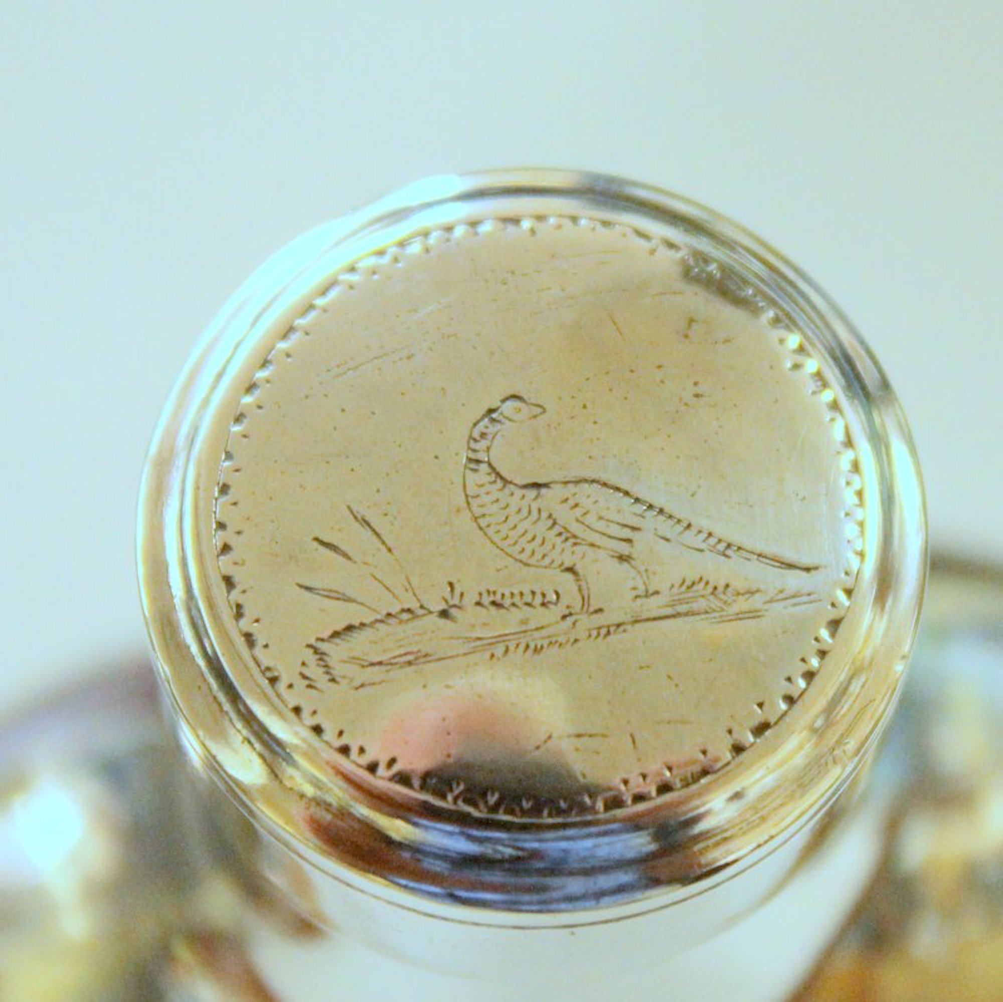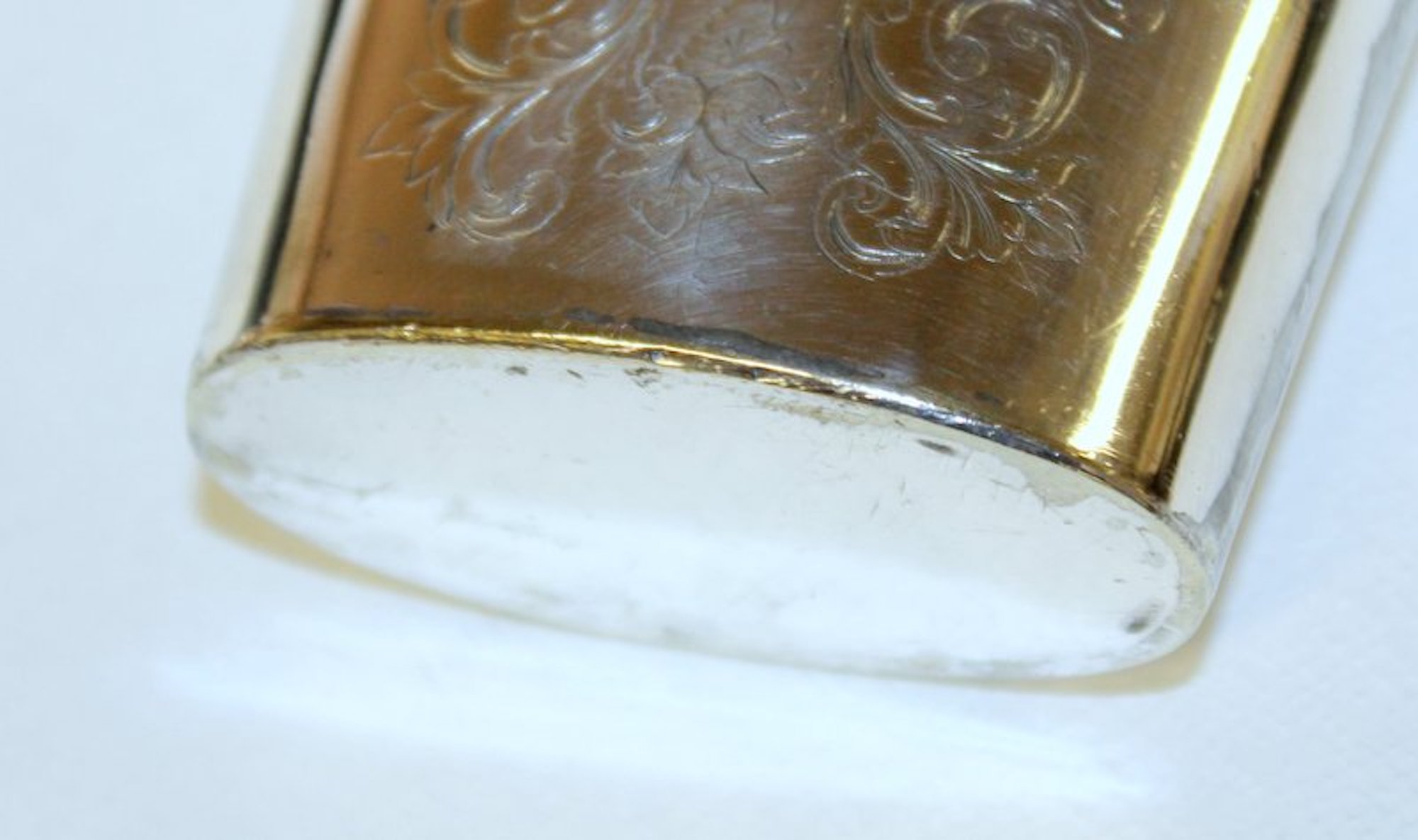 A bit of plate loss noted near bottom on one side and a little bit on the base. “Mark” on the screw top is not a recognizable ‘maker’s mark if a maker’s mark at all. Please note the exceptional “bright cut” hand engraving overall and the hand engraved partridge or pheasant on top of