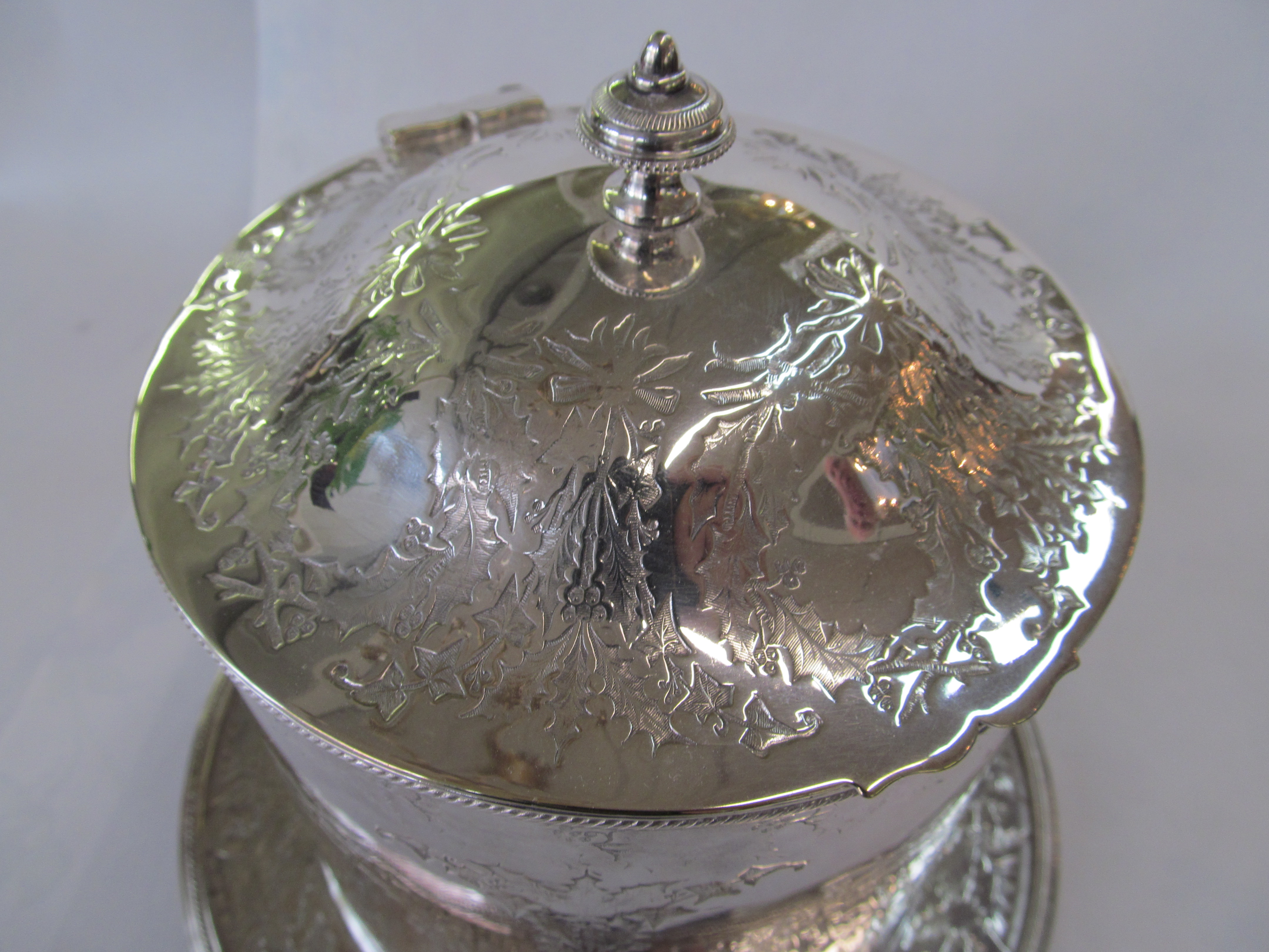 Antique English Silverplate Fine Flat Chased “Holly” Motif Round Biscuit Box. Circa 1867-85