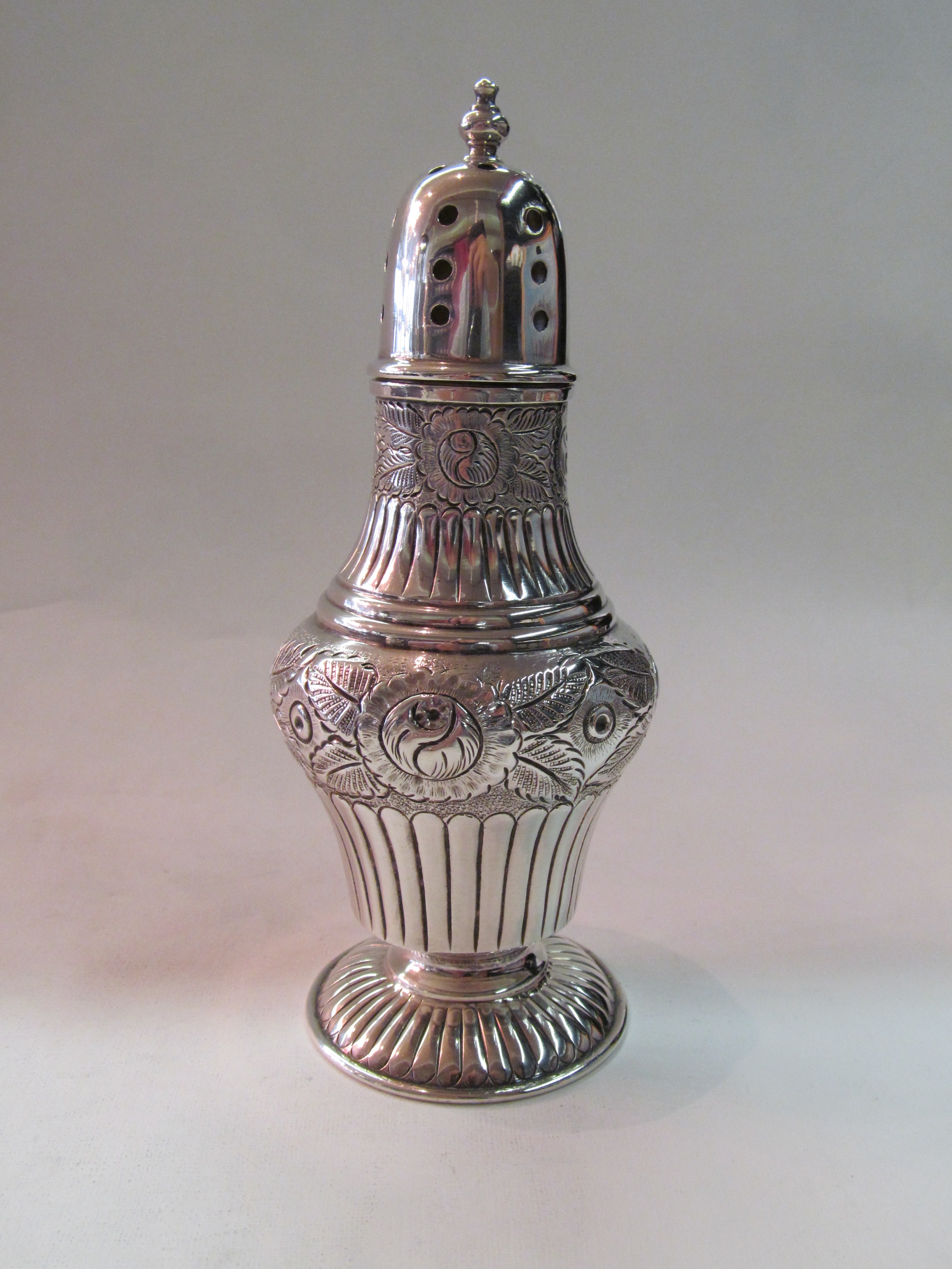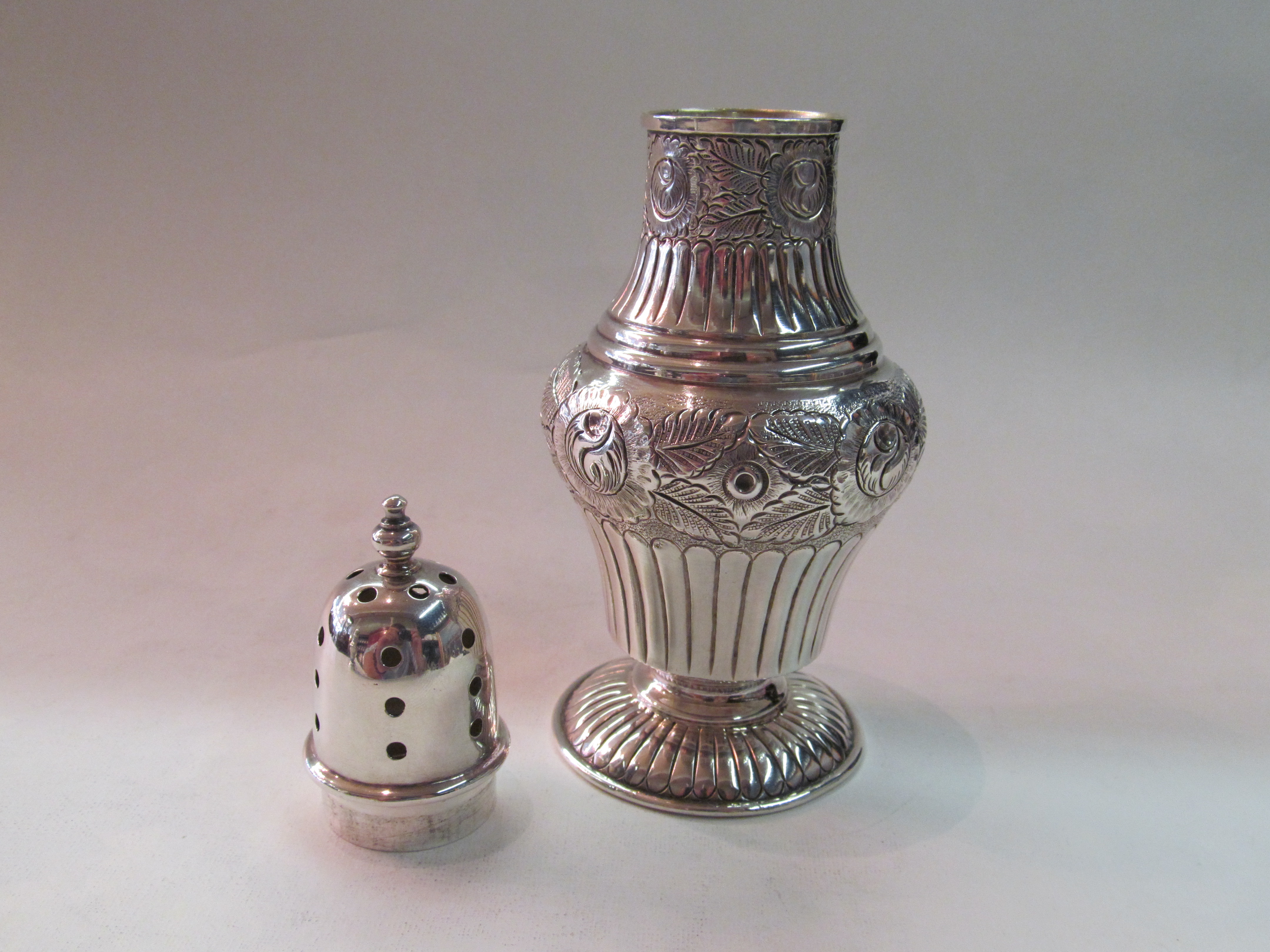 Fine Old English Silverplate hand chased Sugar Dredger or Muffineer.